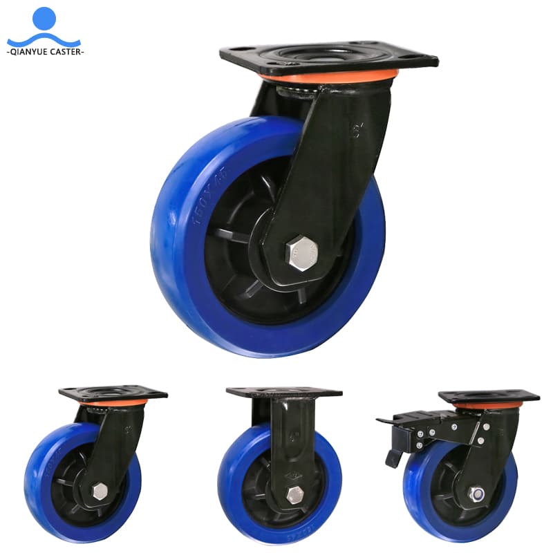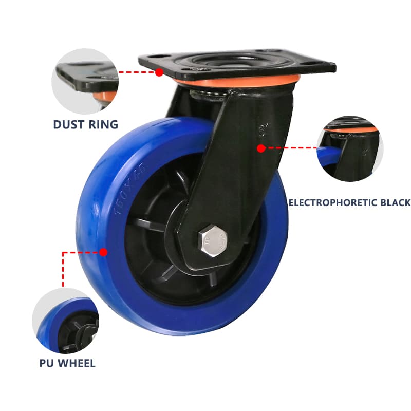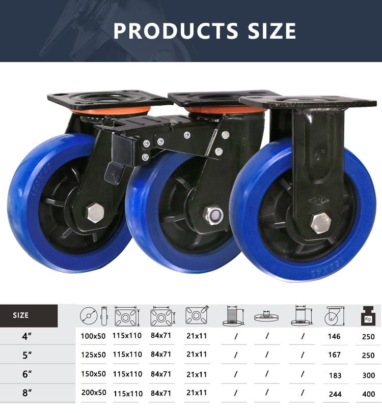 This range of heavy-duty casters, available in 4, 5, 6, and 8 inches, is the perfect choice for those who need a durable, quiet, and ergonomic caster that can meet the needs of nearly any environment. These casters feature high-quality elastic rubber wheels that are wear-resistant and durable. The casters come with a dust ring that prevents dust from entering the interior, ensuring long-lasting performance. The electrophoretic black finish makes these casters unbreakable. Paired with a thickened base plate, these casters provide superior load-bearing capacity.