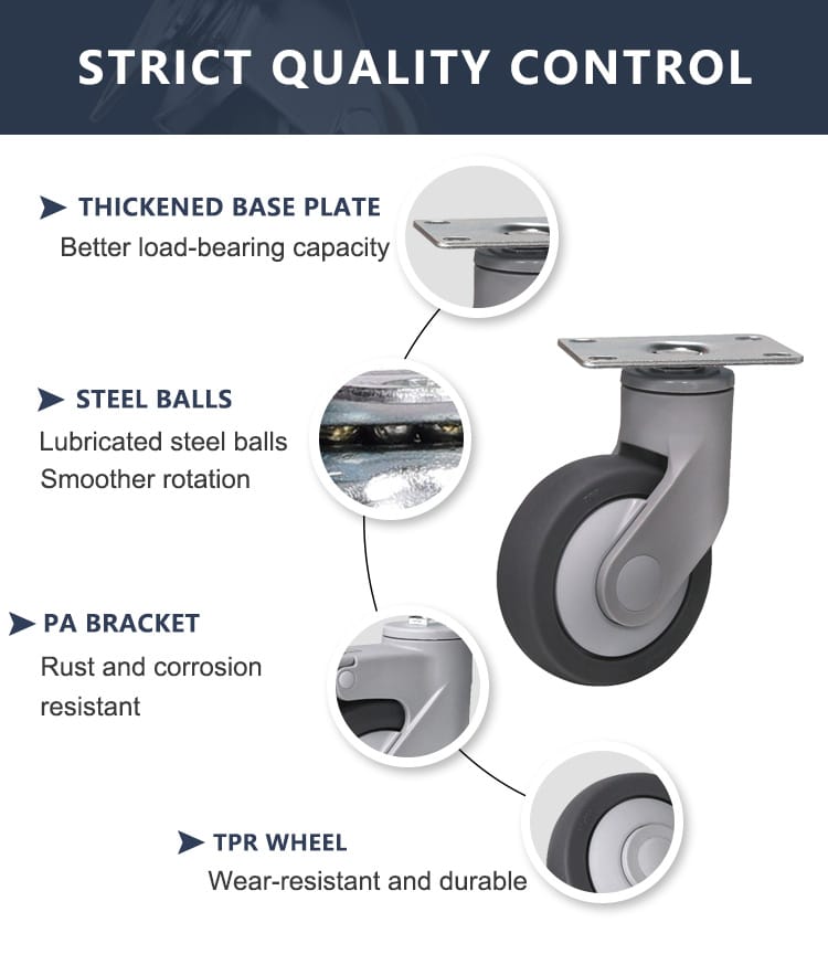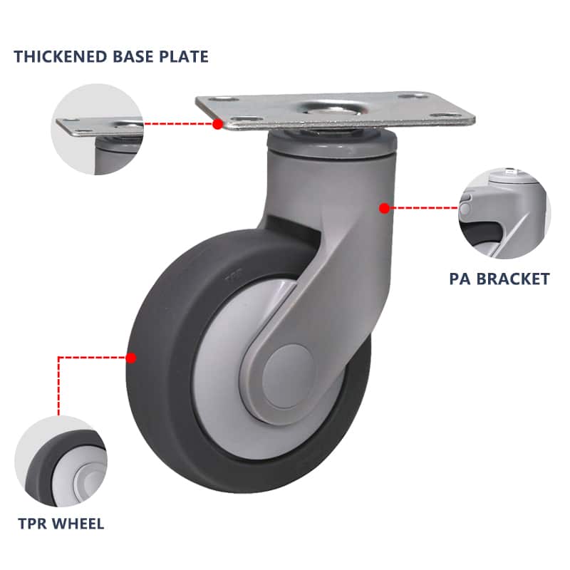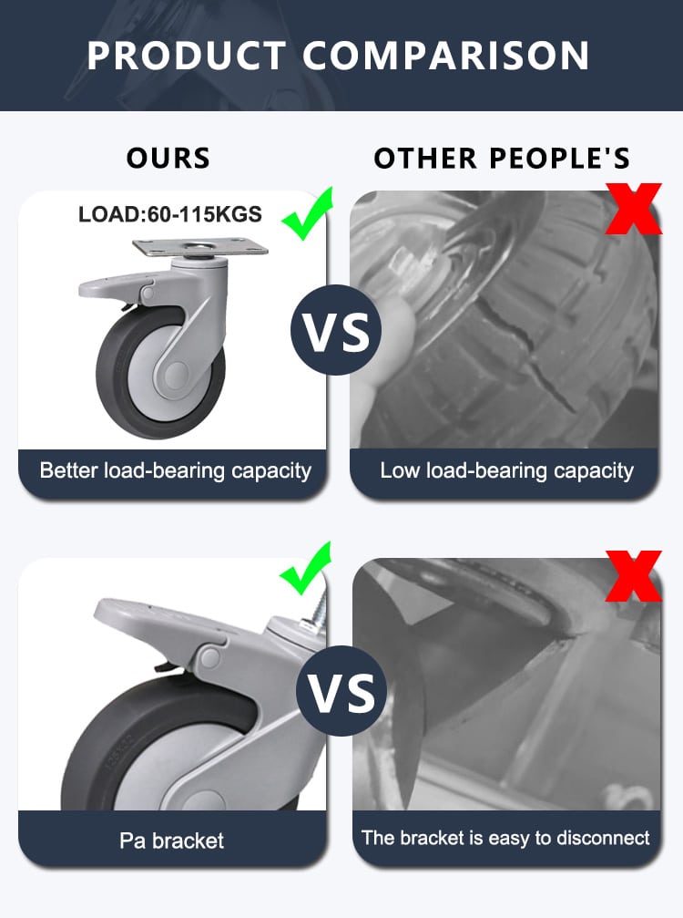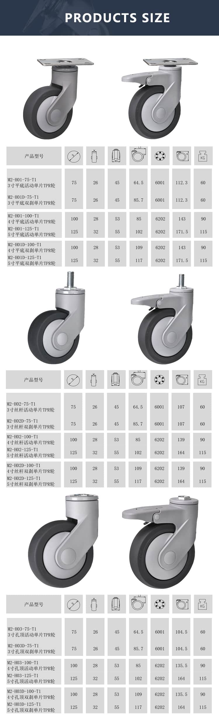 This range of hospital bed parts equipment casters, available in 3, 4, and 5 inches, is designed for medical environments that require durable, quiet, and ergonomic solutions. These medical casters feature high-quality TPR (thermoplastic rubber) wheels that are wear-resistant and durable. The thickened base plate ensures superior load-bearing capacity, while lubricated steel balls provide smoother rotation. The PA (polyamide) bracket is rust and corrosion-resistant, ensuring long-lasting performance.