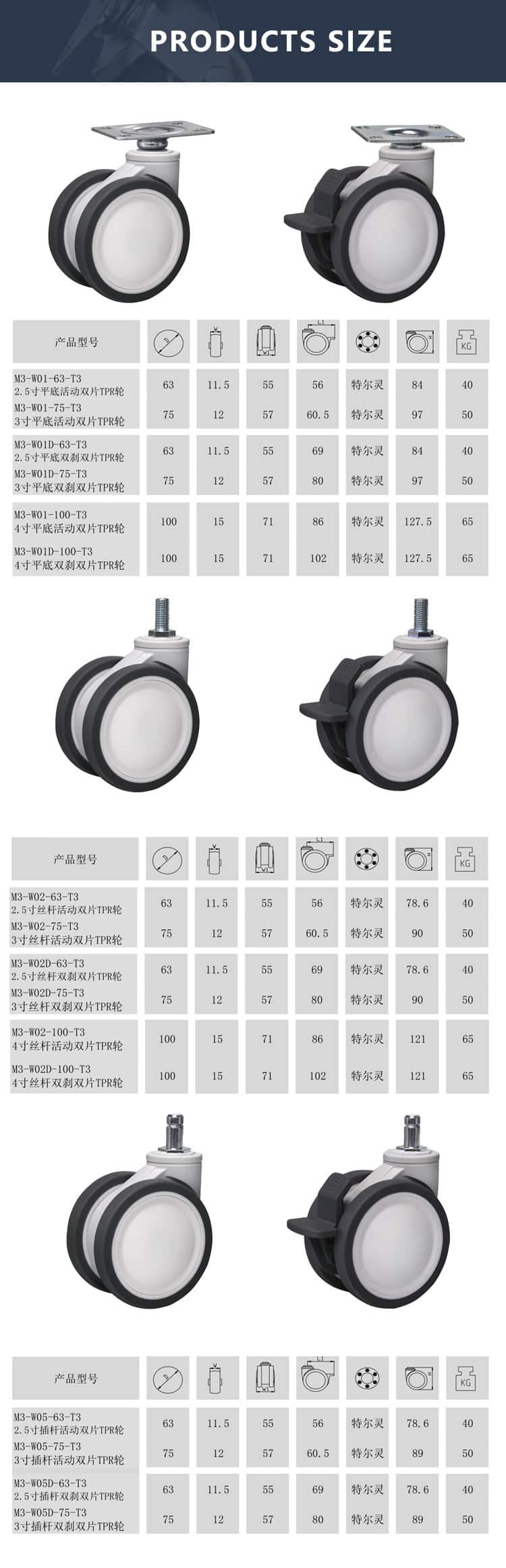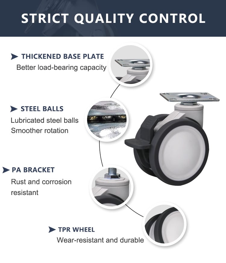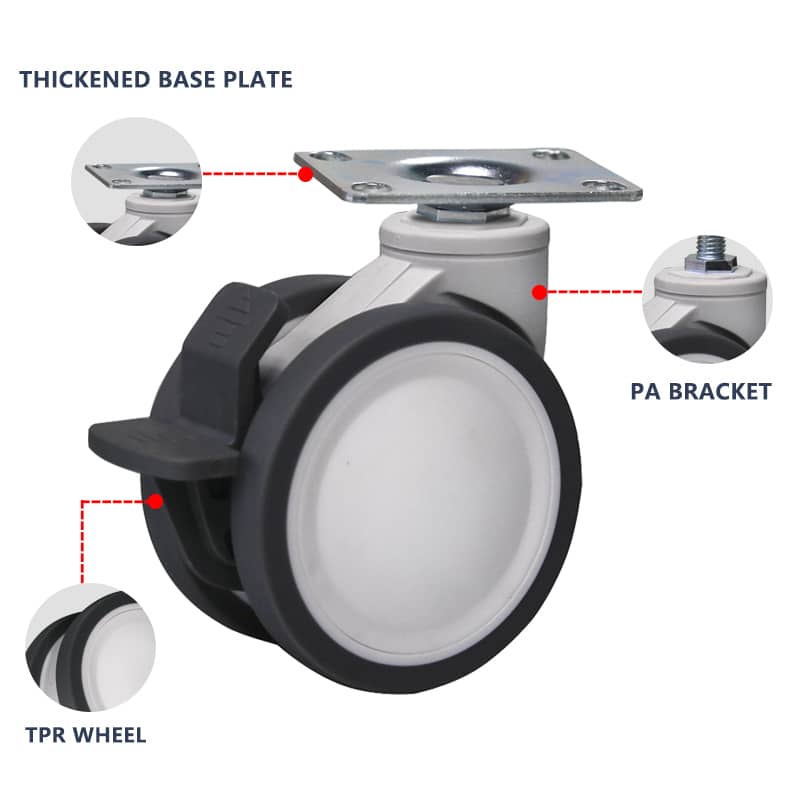 Introducing the M4 Series: TPR Twin Wheel with Bearing Medical Casters, designed for high-performance in medical and childcare environments. These casters feature high-quality TPR twin wheels, lubricated steel ball bearings, and a robust PA (polyamide) bracket, ensuring durability and smooth operation.