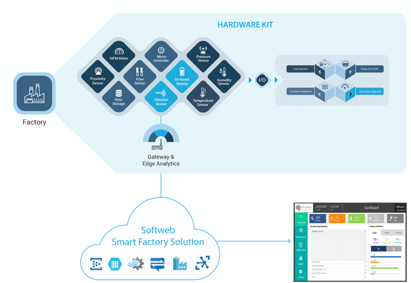Our Industry 4.0 solution enables manufacturers to connect multiple production lines and machines, acquire data at different stages of production from several disparate sources, and develop capabilities like remote monitoring, edge analytics, and predictive maintenance, and digital twin.